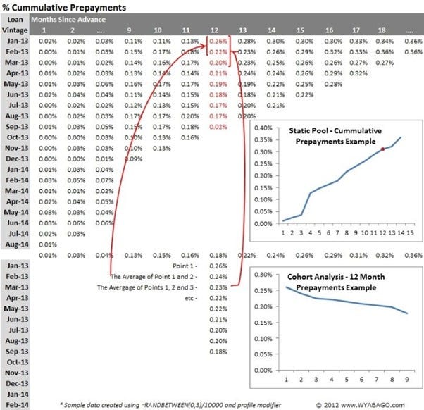 In the sample above then, we can see 12 month prepayments are falling over time (something that is already quite obvious in the numbers in this small sample) but also that our final data point (0.18%) ties in with the current Static Pool position for point 12 (the red dot). What you have then is the Dynamic month by month performance, tied together with the that Static Analysis and a very easy approach to track the long run and short run metrics at the same time.